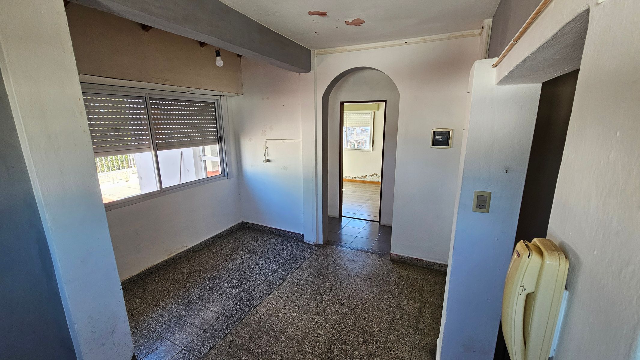 SEGUNDO piso por escalera, por la escalera comun solo acceden 2 departamentos. Este es el ultimo y en segundo piso. Posee cocina y comedor en L de pequeñas proporciones, dos dormitorios de 3x3 uno con ropero, sector de lavadero, baño completo, patio descubierto exterior con barandas a la calle.
